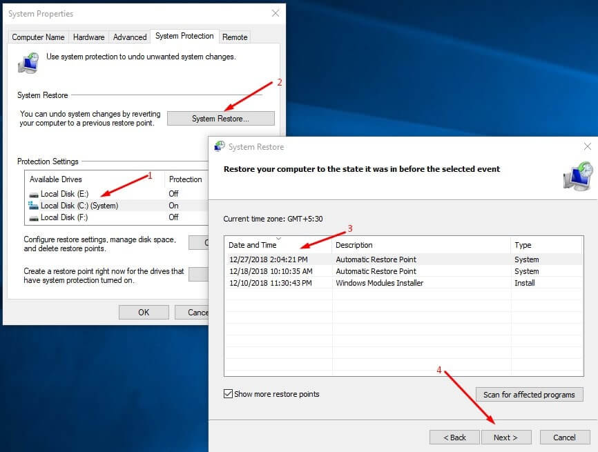 Sélectionnez un point de restauration précédent avant l’apparition de l’erreur et cliquez sur Suivant.