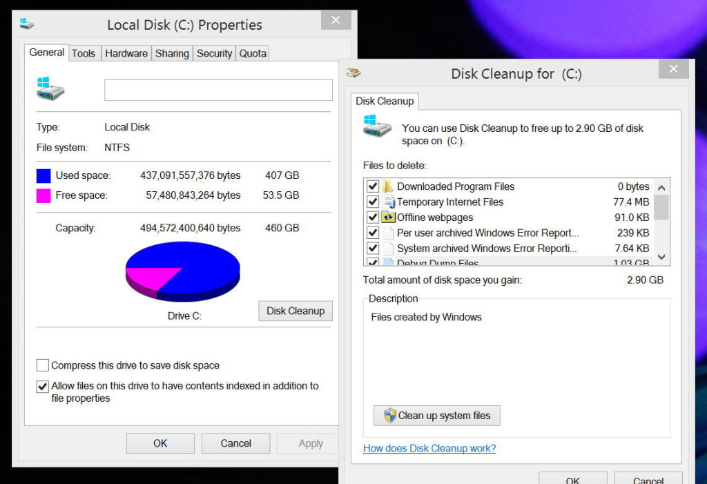 Lorsque vous trouverez l’outil Nettoyage de disque, cliquez sur Nettoyer les fichiers système et assurez-vous de vérifier tout le contenu que vous souhaitez supprimer. Cette tâche est importante pour “Fichiers Internet temporaires”, “Corbeille” et les fichiers de rapport d’erreur.