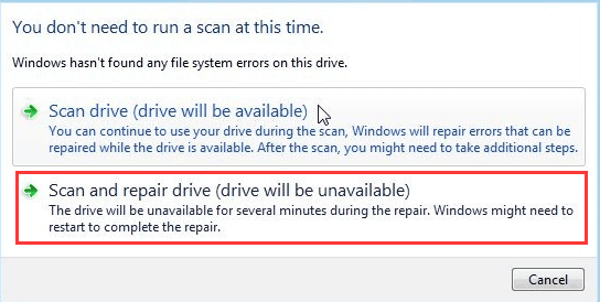 • À la fin du processus, la boîte de dialogue Vérification des erreurs peut apparaître. Cliquez ici sur Scan and repair drive> suivez les instructions à l’écran pour réparer les erreurs.
