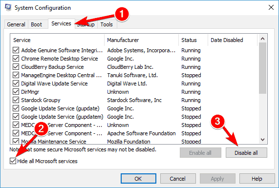 - Choisissez Configuration du système> onglet Services> choisissez de masquer tous les services Microsoft.